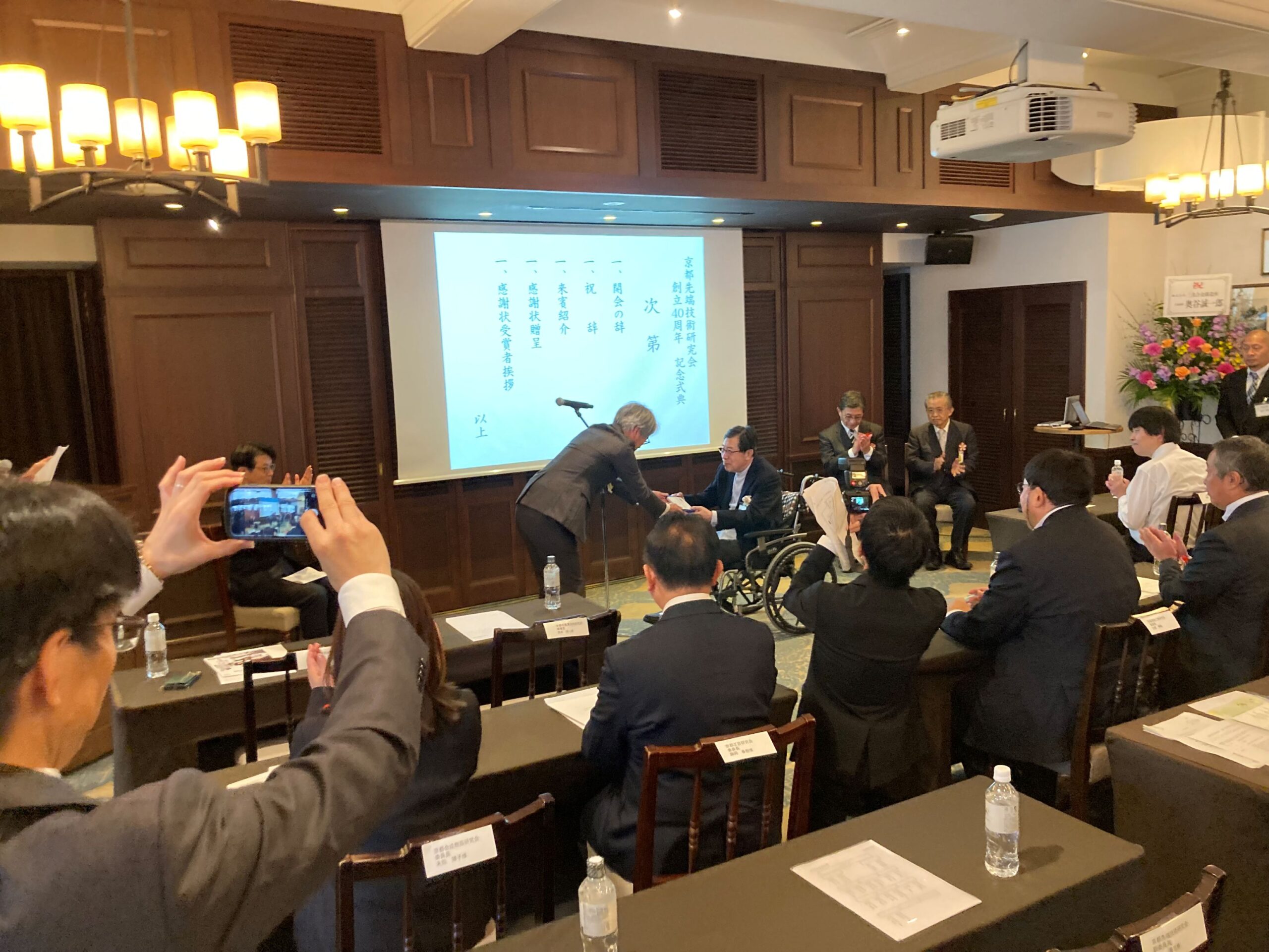 京都先端技術研究会は、京都市における先端技術の振興と産業発展を目的に、産学官が連携して活動する技術交流組織であり、地域のものづくりを支える重要な役割を担っています。当日は京都市長の松井孝治氏をはじめ多くの関係者が出席し、40周年を祝う式典が盛大に執り行われました。
