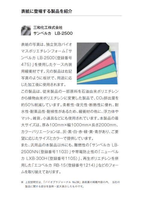 この度、日本バイオプラスチック協会(JBPA)が発行する「バイオプラジャーナル No.94」の表紙に、当社製品「サンペルカ LB-2500」が掲載されました。
